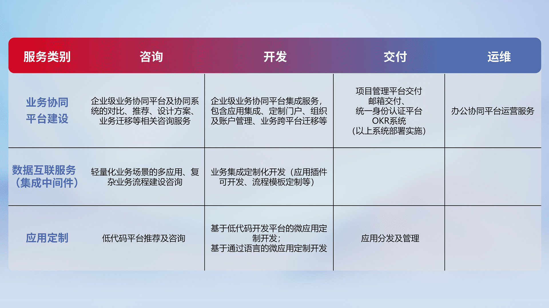针对钉钉、、、、企微、、IDaas等平台级产品提供产品的规划、、、、方案、、交付、、、定制化开发等服务,,,,实现如统一协同办公、、、智能客户服务、、、混合会议管理、、、、智能数据查询、、、、等业务场景,,,,实现数字化转型。。。